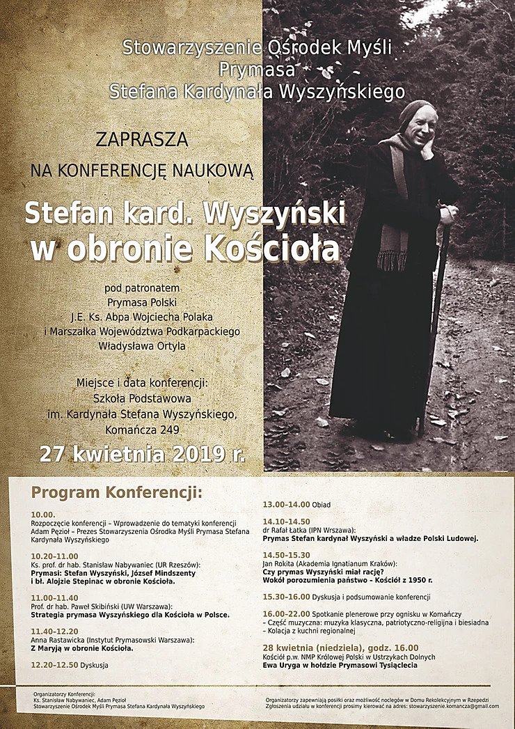 Stowarzyszenie Ośrodek Myśli Prymasa Stefana Kardynała Wyszyńskiego zaprasza na konferencję naukową: „Stefan kard. Wyszyński w obronie Kościoła” pod patronatem Prymasa Polski J. E. Ks. Abpa Wojciecha Polaka i Marszałka Województwa Podkarpackiego Władysława Ortyla.